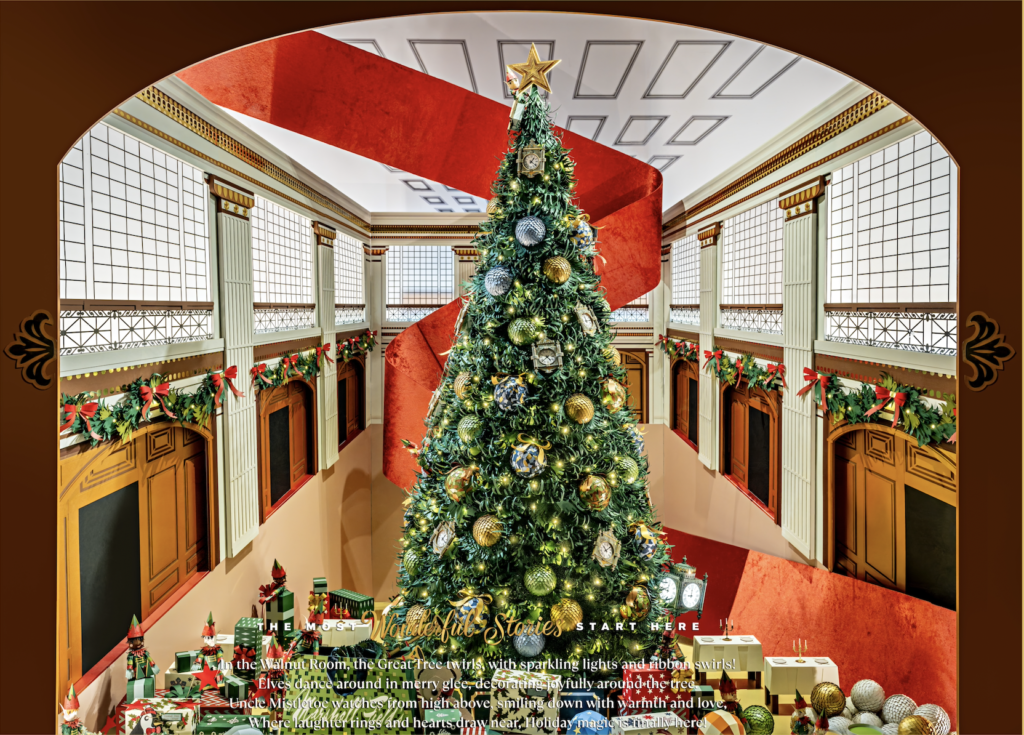 The narrative begins with a nostalgic homage to the early days of Marshall Field’s, unfolding like an illuminated pop-up book. Within it, the Tiffany dome, golden trumpets, and graceful reindeer evoke the grandeur of the turn-of-the-century store. From here, the story gently transitions into the warm glow of The Walnut Room, where the legendary Great Tree rises through multiple levels, its branches alive with elves — and the familiar silhouette of Uncle Mistletoe playfully hidden among ornaments inspired by Macy’s own heritage.