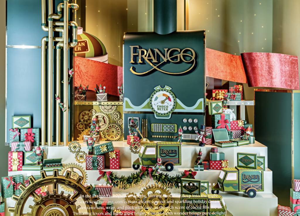 A shift in atmosphere leads us into the whimsical world of the Frango chocolate factory, where tiny conveyor belts and miniature delivery cars transform the making of Frango chocolates into a joyful dance of motion and mischief. This energy carries into a celebration of the golden age of holiday windows of the 1940s and ’50s: a stylized State Street façade where miniature showcases recall beloved classics such as The Nutcracker and A Christmas Carol, honoring the era when festive windows became a cultural ritual.