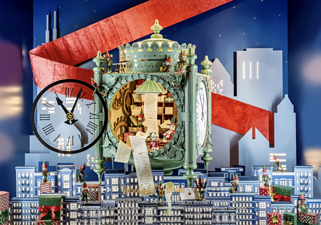 This project for Macy’s Chicago is especially close to our hearts. Designed and built entirely from paper, the installation celebrates the city’s rich holiday heritage and the timeless beauty of the historic Marshall Field’s building — a place where generations have gathered beneath the Great Tree and the grand State Street clock. Our creative scope spanned concept to completion, with 2224 hours of production, 925 hours of graphic design, and 275 hours of packaging, shaping a world where handcrafted layers tell the story of Chicago’s most iconic holiday traditions.