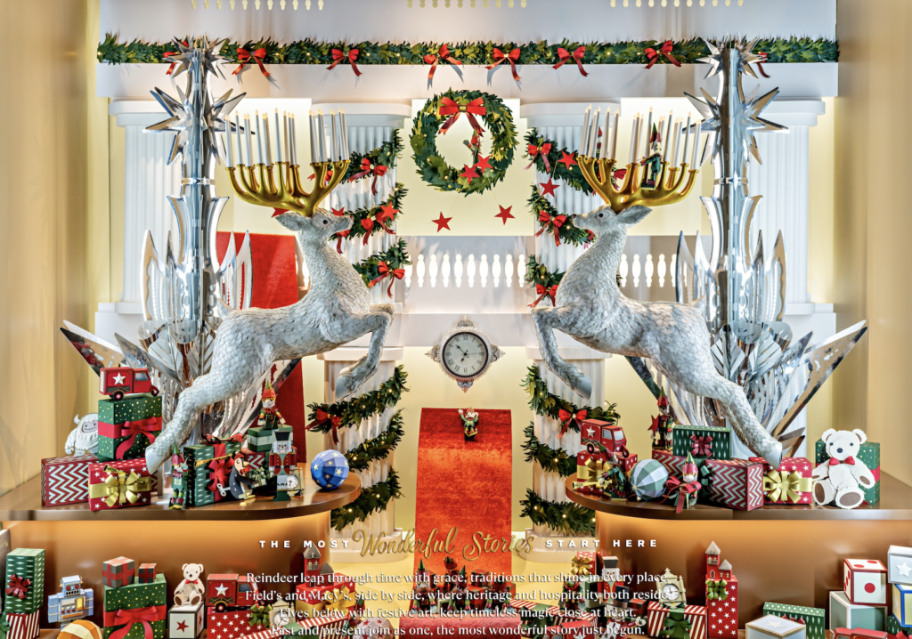 The journey concludes with a festive composition that bridges past and present. Iconic Marshall Field’s reindeer leap across a landscape where the historic emblem stands proudly above, while below, the Macy’s star is carried forward by cheerful elves — a symbolic passing of the torch, affirming that Macy’s continues the legacy with care and reverence.